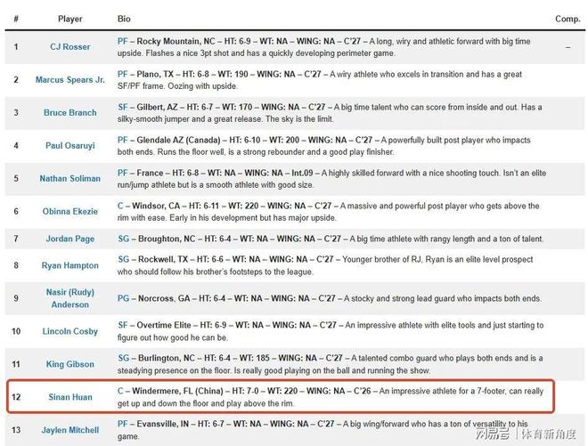 去年,知名美国选秀媒体NBA Draft Room发布了2028年NBA选秀预测榜单,郇斯楠赫然在列,被预测为2028年首轮第12顺位秀。要知道,NBA Draft Room可是全美极具权威性的选秀媒体。此前他们预测杨瀚森会在首轮第22顺位被选中,而最终结果与预测仅相差6个顺位,在所有选秀媒体中,其预测准确度名列前茅。